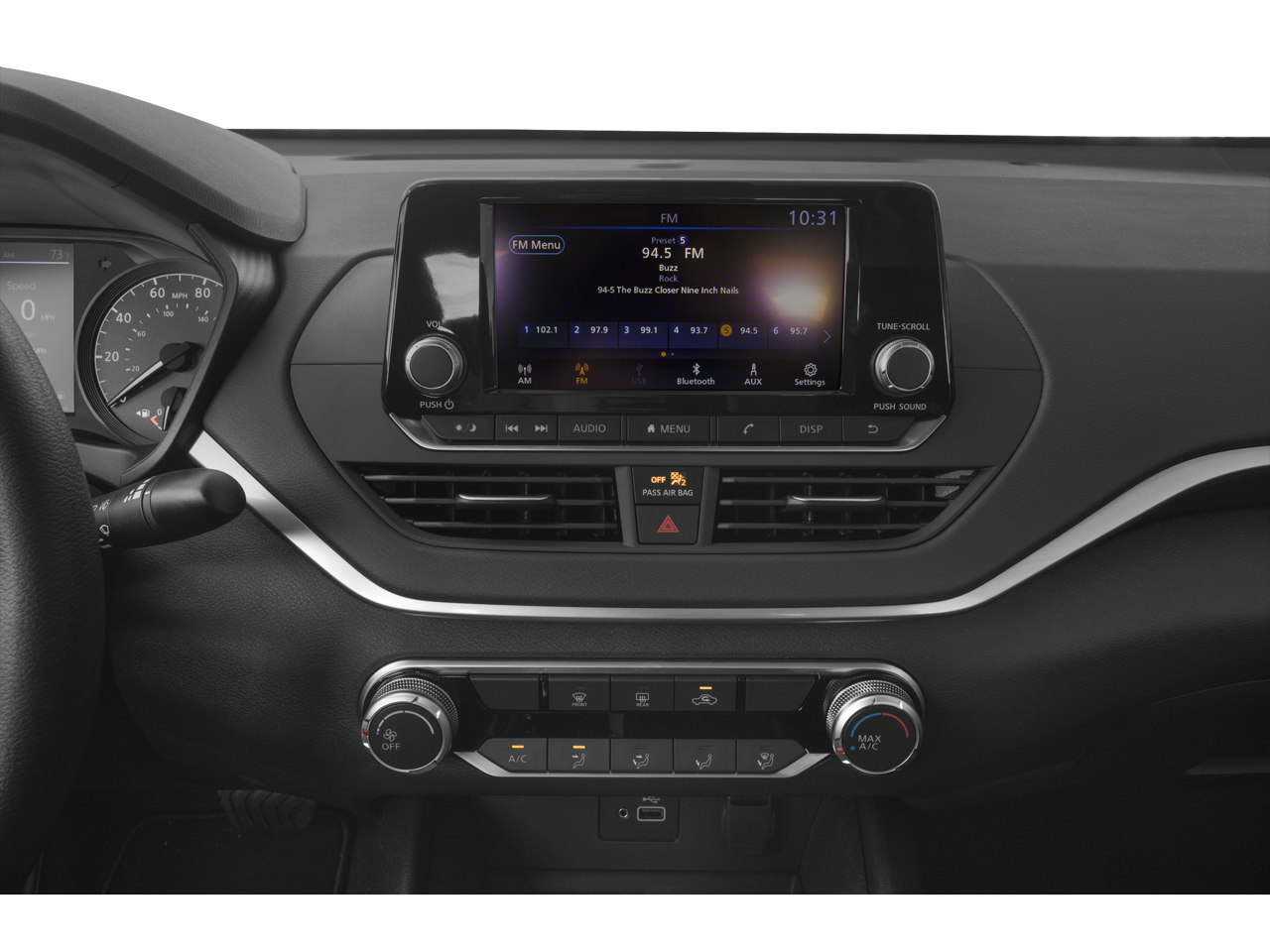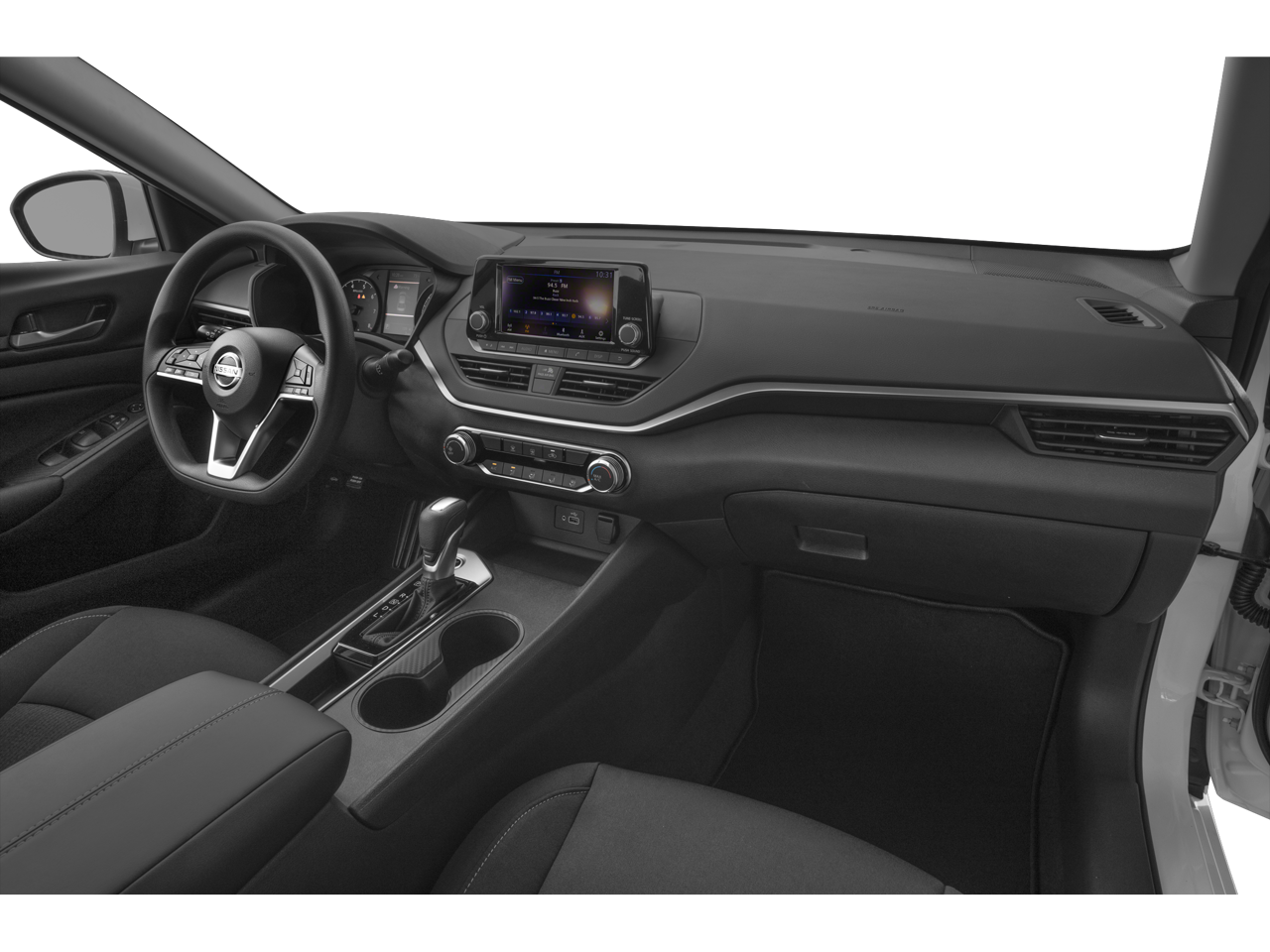 The Altima's exterior radiates a refined, modern aesthetic with its sleek, sculpted lines and striking white paint. Step inside and you'll be greeted by a well-appointed cabin, featuring premium cloth upholstery, a sport steering wheel, and a host of convenient amenities. Stay connected with the AM/FM audio system, and enjoy the comfort of automatic climate control and power windows.