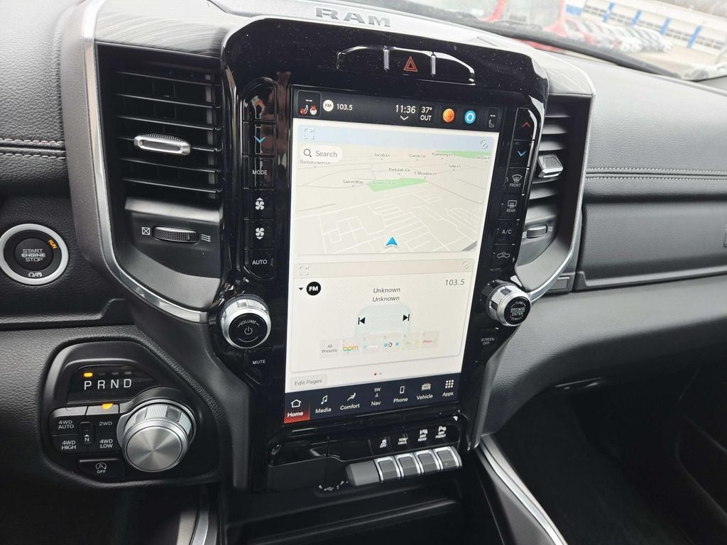 This 1500 is well Equipped with Laramie Level 1 Equipment Group (12 Touchscreen Display, 2nd Row In Floor Storage Bins, 4G LTE Wi-Fi Hot Spot, Apple CarPlay, Auto High Beam Headlamp Control, Blind Spot & Cross Path Detection, Connected Travel & Traffic Services, Connectivity - US/Canada, Disassociated Touchscreen Display, Electric Shift-On-Demand Transfer Case, Foam Bottle Insert (Door Trim Panel), For Details, Visit DriveUconnect.com, For More Info, Call 800-643-2112, Front Door Accent Lighting, Front LED Fog Lamps, Global Telematics Box Module (TBM), Google Android Auto, GPS Antenna Input, GPS Navigation, HD Radio, Integrated Center Stack Radio, Integrated Voice Command w/Bluetooth®, LED Reflector Headlamps, Radio: Uconnect 5 Nav w/12.0 Display, Rain Sensitive Windshield Wipers, Rear Door Accent Lighting, Rear Power Sliding Window, Rear Window Defroster, Remote Tailgate Release, SiriusXM Radio Service, SiriusXM w/360L, and USB Host Flip), Quick Order Package 27H Laramie, Sport Appearance Package (Black Interior Accents, Body Color Exterior Mirrors, Body Color Front Bumper, Body Color Premium Power Mirrors, Body Color Rear Bumper w/Step Pads, Grille Surround 3 Body Color Tex 2 Black, RAM Grille Badge - Chrome, Sport Decal, Sport Performance Hood, and Wheels: 20 x 9 Premium Painted w/Inserts), #1 Seat Foam Cushion, 10 Speakers, 3 Rear Seat Head Restraints, 3.21 Rear Axle Ratio, 4 Way Front Headrests, 4-Wheel Disc Brakes, 48V Belt Starter Generator, ABS brakes, Adjustable pedals, Air Conditioning, Alloy wheels, AM/FM radio: SiriusXM with 360L, Apple CarPlay/Android Auto, Audio memory, Auto-dimming door mirrors, Auto-Dimming Exterior Driver Mirror, Auto-dimming Rear-View mirror, Automatic temperature control, Brake assist, Bumpers: chrome, Chrome Exterior Mirrors, Compass, Convex Wide-Angle Exterior Mirror Insert, Delay-off headlights, Driver door bin, Driver Seat Memory, Driver vanity mirror, Dual front impact airbags, Dual front side impact airbags, Electronic Stability Control, Exterior Mirrors Courtesy Lamps, Exterior Mirrors w/Heating Element, Exterior Mirrors w/Memory, Exterior Mirrors w/Supplemental Signals, Front anti-roll bar, Front Center Armrest w/Storage, Front dual zone A/C, Front fog lights, Front reading lights, Front Seat Back Map Pockets, Front wheel independent suspension, Fully automatic headlights, Garage door transmitter, Heated door mirrors, Heated Front Seats, Heated front seats, Heated Steering Wheel, Heated steering wheel, Illuminated entry, Leather steering wheel, Leather Trim 40/20/40 Bench Seat, Low tire pressure warning, Manufacturer's Statement of Origin, Memory seat, MOPAR Front & Rear Rubber Floor Mats, Navigation System, Occupant sensing airbag, Outside temperature display, Overhead airbag, Overhead console, Panic alarm, ParkSense Front/Rear Park Assist w/Stop (DISC), ParkView Rear Back-Up Camera, Passenger door bin, Passenger vanity mirror, Pedal memory, Power 2-Way Driver Lumbar Adjust, Power 2-Way Passenger Lumbar Adjust, Power 8-Way Driver & Passenger Seats, Power door mirrors, Power driver seat, Power passenger seat, Power steering, Power windows, Power-Folding Mirrors, Radio data system, Radio: Uconnect 5 Nav w/8.4 Display, Rear 60/40 Folding Seat, Rear anti-roll bar, Rear seat center armrest, Rear step bumper, Rear Wheelhouse Liners, Remote keyless entry, Security system, Speed control, Split folding rear seat, Steeri
