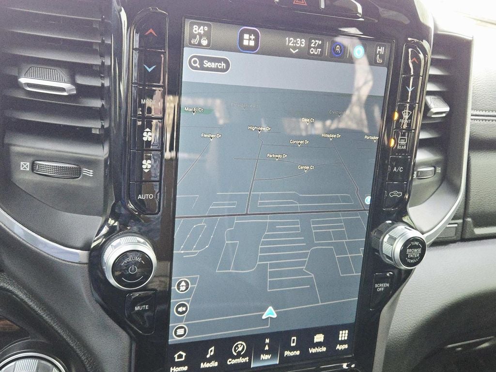 The Laramie trim level elevates this Ram 1500 with a host of premium features that prioritize comfort, convenience, and technology. The dual-pane panoramic sunroof lets you enjoy the great outdoors, while the 12-inch touchscreen display with Uconnect 5 navigation keeps you connected and informed. The premium harman/kardon sound system provides an immersive audio experience, and the blind spot and cross-path detection systems help you navigate with confidence.